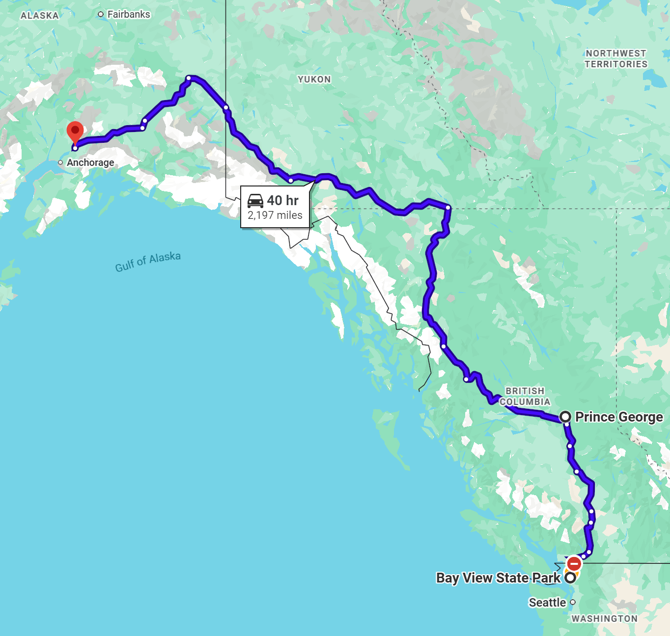 - I couldn’t find a travel route app (I know they are out there!) that clearly highlighted campgrounds and gas stations along the route to Alaska, and